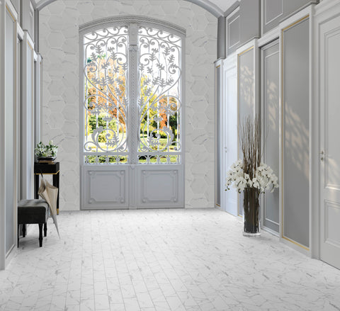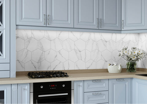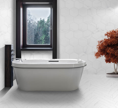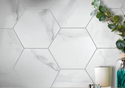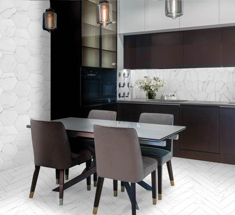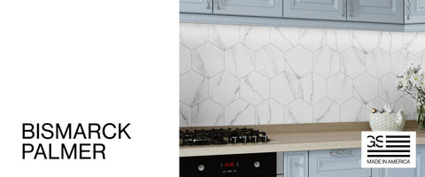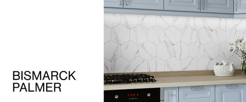 BISMARCK PALMER, meticulously crafted with a blend of hexagonal and rectangular shapes. Infused with the timeless elegance of marble veining, each tile is a masterpiece, exuding an abstract and cool allure that effortlessly elevates any space.