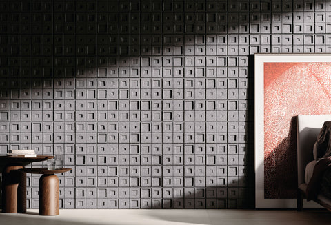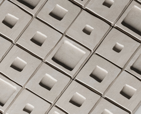 Sculptural mosaics like ancient vessels in three dimensions, their geometric figures commanding shadow and light. In four earthen tones, both dimensional pieces and smooth field tiles unite to transform spaces through the raw honesty of clay and the precision of contemporary forms.