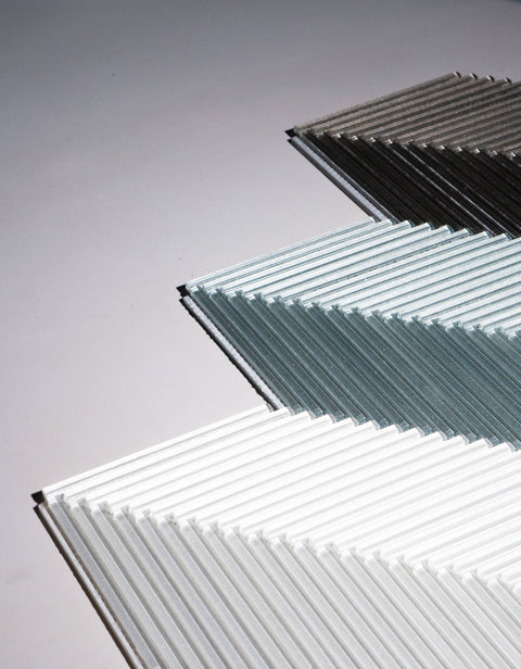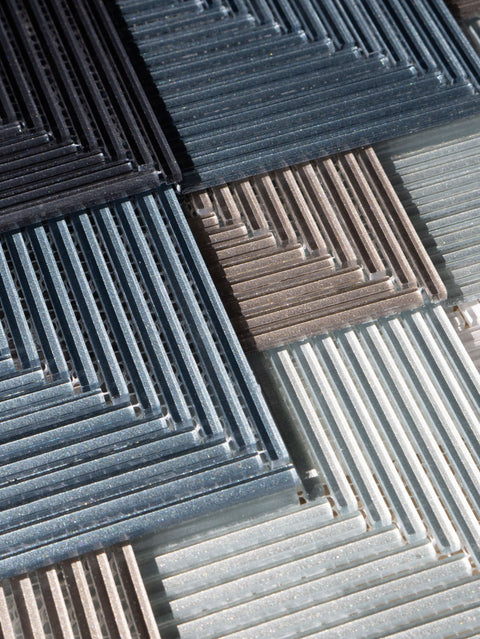 Six sophisticated cool-toned neutrals flow together in a precise chevron rhythm; slender glass pieces united in refined geometry. Every angle catches light differently, creating depth that shifts with your perspective.